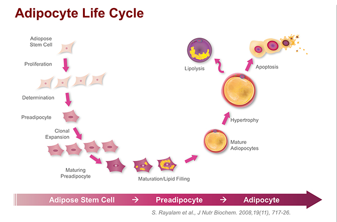 비만과 관련된 지방세포는 인체에서 대사에 관여하는 중요한 기관 중의 하나로 단순한 에너지의 저장기관이 아니라 여러 가지 호르몬을 분비하는 내분비기관이기도 하며, 인체 대사에서 대단히 능동적으로 작용하는 장기이다. 섭취한 영양소는 중성지방(triglyceride)의 형태로 지방 조직에 축적되며, 비만은 지방세포의 비대(hypertrophy)와 과형성(hyperplasia)으로 초래된다. 이러한 에너지의 과도한 저장을 막기 위해서는 에너지 흡수를 최소화하고 에너지 사용을 증대시키는 것이 필요하므로, 지방세포 연구는 지방 축적을 감소시키고 지방세포의 수를 줄이는 방안을 찾아내는 것이 핵심이다.